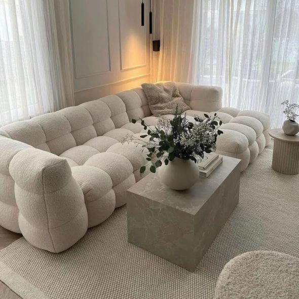 An Kinnu Cotton Candy L shaped luxury sofa combines both style and functionality, offering ample seating and a modern, sophisticated design. It’s ideal for larger living spaces like living rooms or lounges, providing a comfortable area for socializing, lounging, or even entertaining. When considering a luxury L-shaped sofa, there are several elements to keep in mind: